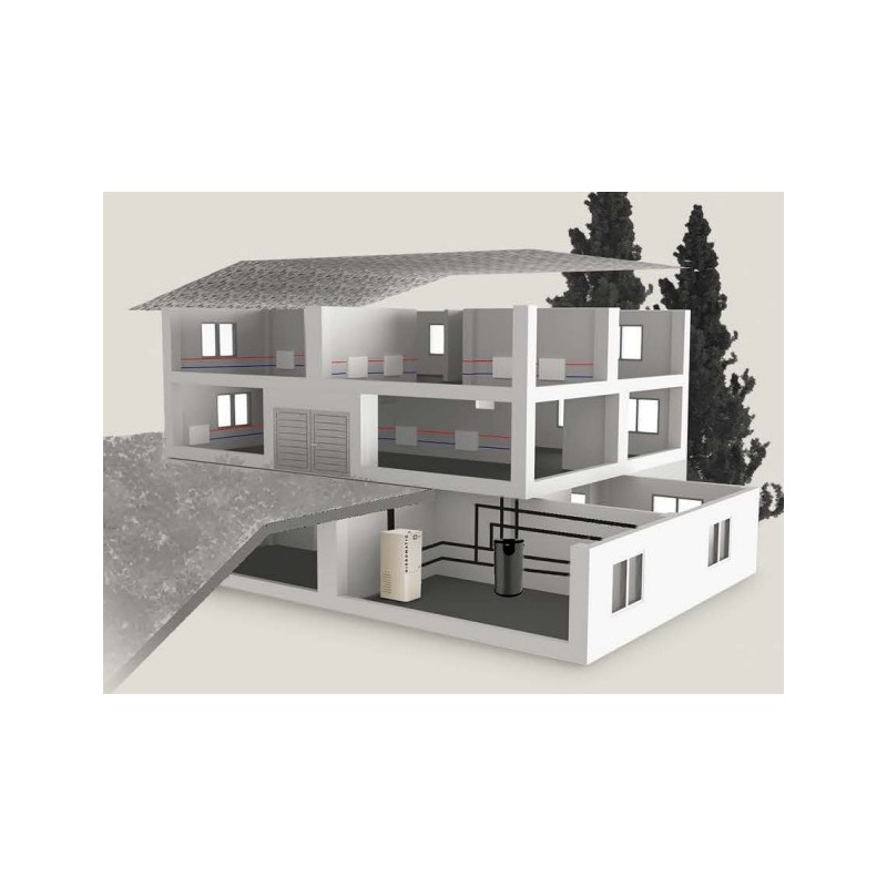 Wärmeeinheit, einschließlich Ausdehnungsbehälter, hocheffizienter hydraulischer Umwälzpumpe, 3-bar-Sicherheitsventil, Manometer und automatischer Falle.