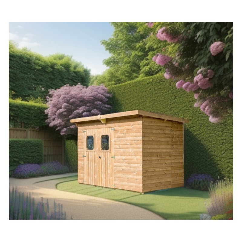 This Theora shelter has a single-slope roof with corrugated plate cover Undulating, its maximum height is 2.20m and that of the walls 1.82m. Simple assembly thanks to the pre-assembled panels with a thickness of 19mm, this shelter is delivered without floor, and must be installed on a concrete slab, isolated from wet lifts by a sealing film.