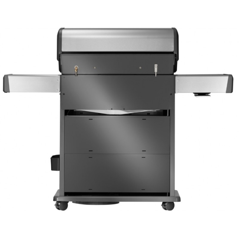 Los quemadores están hechos de acero inoxidable y la rejilla es de hierro fundido esmaltado. El cuenco de la barbacoa está hecho de fundición de aluminio, y la tapa en Acero inoxidable y frente y estantes de acero inoxidable.
