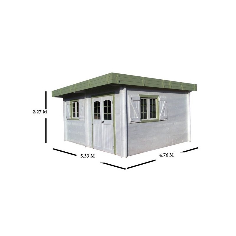 El cobertizo refugio de un superficie exterior (total) de 25,37m² con su techo plano es un producto muy hermoso, que combina el encanto de una construcción de madera cruda y la funcionalidad de un gran espacio abierto.