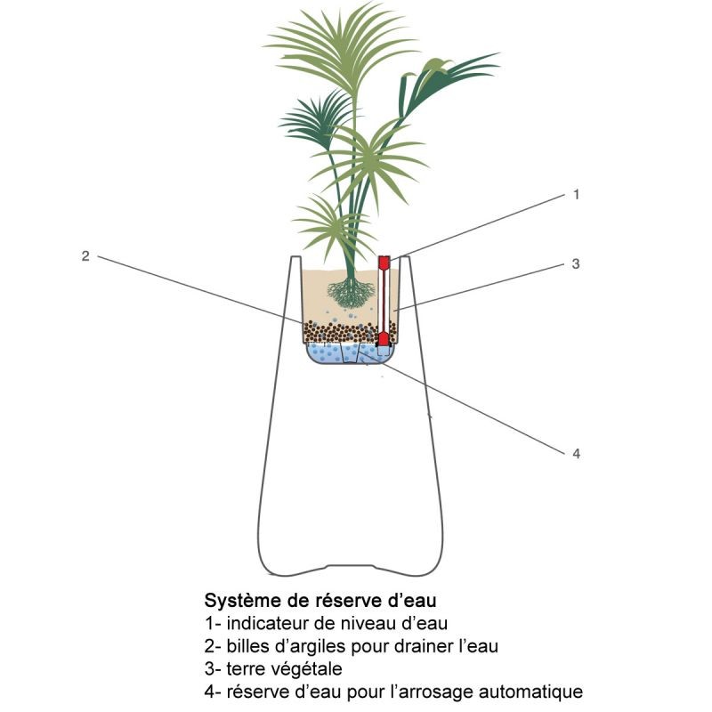 - en 5 versions : double paroi simple, double paroi avec système d'auto-irrigation (autonomie jusqu'à 3 mois), laqué brillant, lumineuse (éclairage fluocompact), à LED (7 couleurs d'éclairage pilotées par une de télécommande fournie).