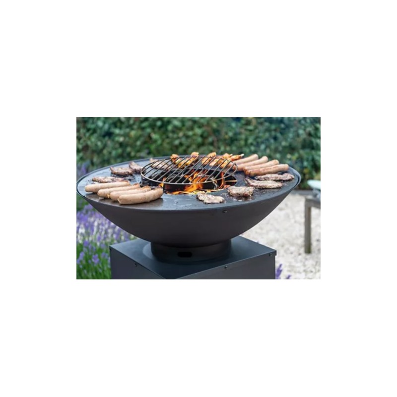 Il Braciere di cottura con riserva di legna e il suo coperchio di protezione e griglia rialzata. Con il suo anello di cottura da 80 cm per 6-8 persone.