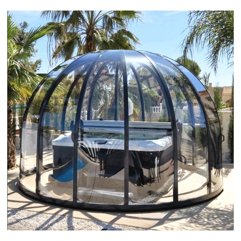 Este espaço móvel tem um diâmetro de 4,74 m e uma altura de 2,30 m Formado por folhas de painéis transparentes de policarbonato de 3 mm para uma vista panorâmica do seu spa.